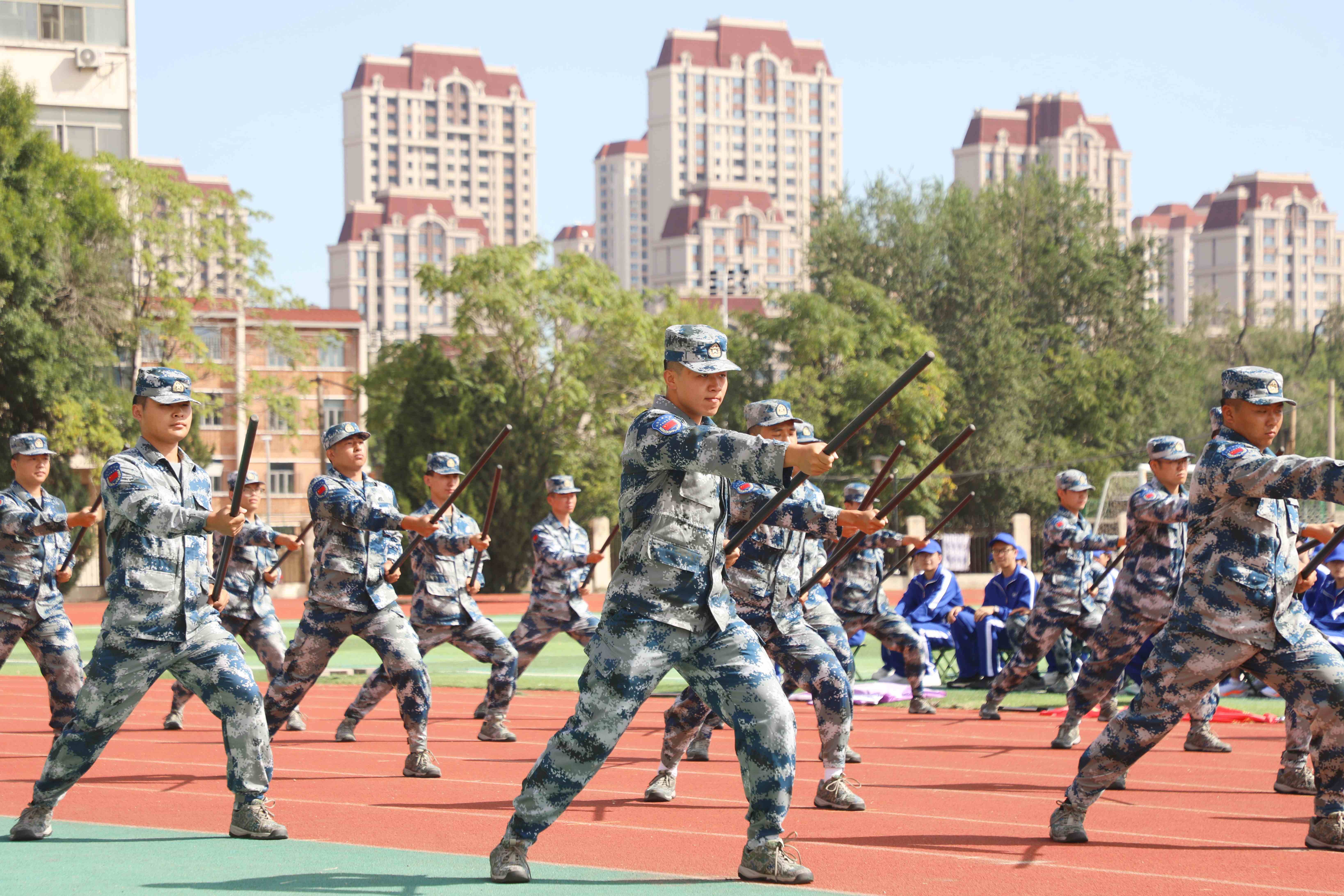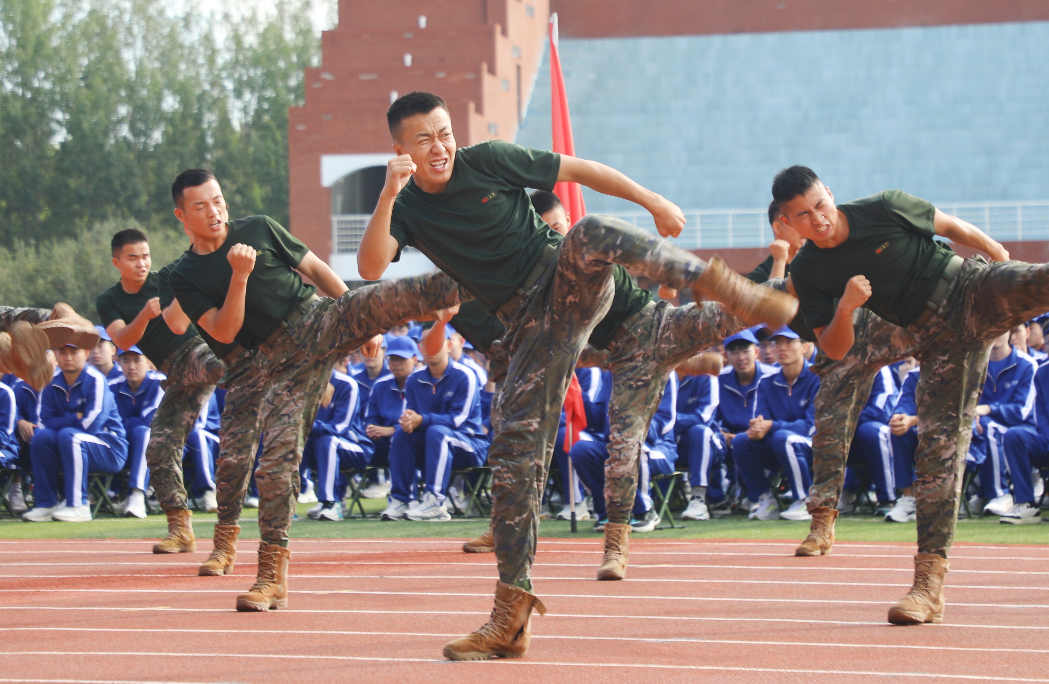 军训教官团为大家带来队列、擒敌拳、应急棍的示范展示,一式一动都充满力量,格挡弹踢的利落、劈棍戳棍的果断,赢得了现场经久不息的掌声。