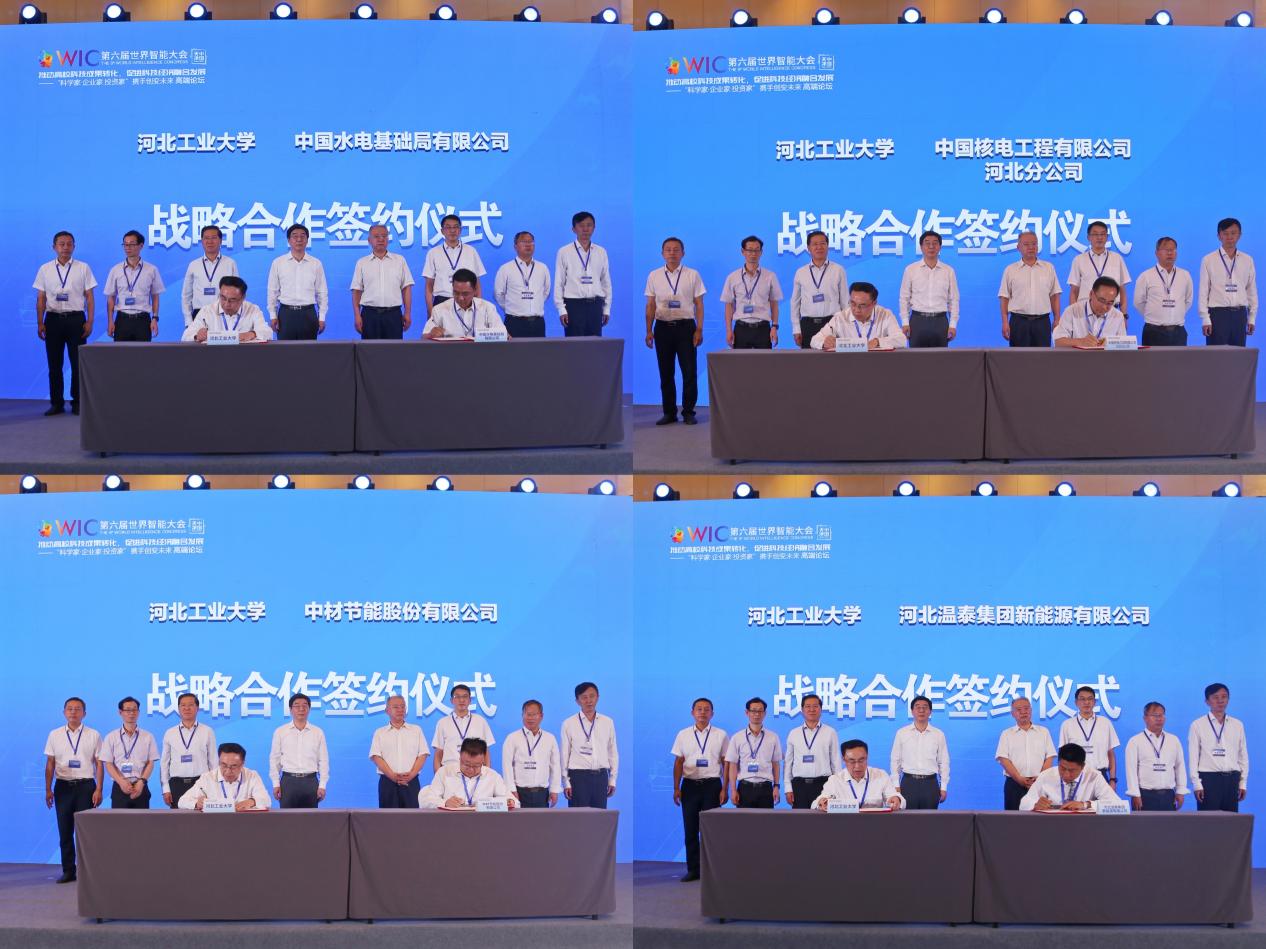 6月25日,第六届世界智能大会“推动高校科技成果转化,促进科技经济融合发展高端论坛”在津举行。高校、政府、企业“三方”携手搭建平台,“科学家、企业家、投资家”围绕科技成果转化,科技经济深度融合发展展开研讨,携手创变未来。校党委书记韩旭与市科协党组成员一级巡视员卢双盈、副校长马国伟、市工信局副局长谷云彪共同为“beat365唯一官网双碳研究院”揭牌。副校长马国伟代表学校与中国水电基础局有限公司等4家国企签署战略合作协议。