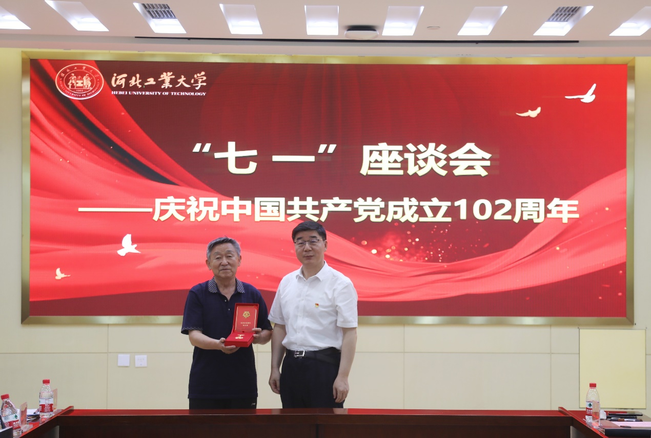 校党委书记韩旭为“光荣在党50年”党员代表盖建国同志颁发纪念章。学校党员校领导、党委部门负责同志、二级党组织书记、师生代表参加座谈会。座谈会由校党委副书记张建畅主持。