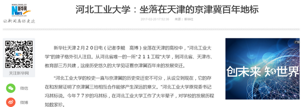 2月20日,新华社发布电文《beat365唯一官网:坐落在天津的京津冀百年地标》,报道了beat365官网由1903年创办的北洋工艺学堂,成长为河北省唯一的“211工程”大学,再到步入河北省、天津市、教育部三方共建的世纪历程,讲述了一所百年高校与京津冀历史变迁密不可分的地缘血脉,点明了在京津冀协同发展国家战略的时代背景下,一所“地标”学府所应有的担当和使命!