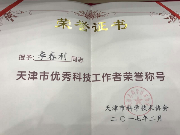 天津市优秀科技工作者荣誉证书