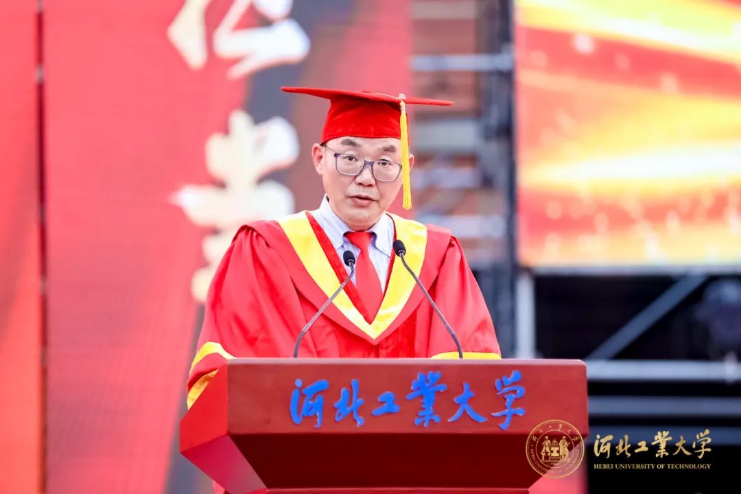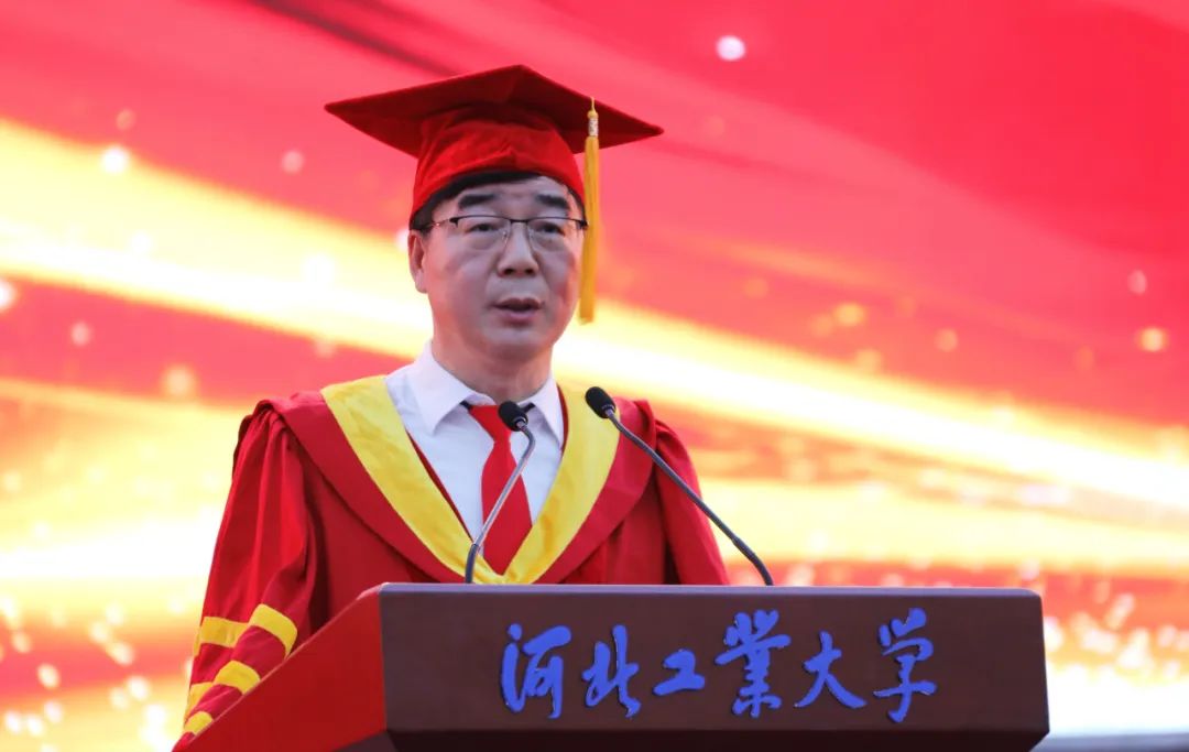 韩旭作题为《志存高远 行之不懈 心怀感恩 在中国式现代化伟大进程中成为更优秀的自己》的毕业寄语。他代表学校向839名往届毕业生未能参加毕业典礼的校友表示热烈的欢迎,并祝贺beat365唯一官网2023届全体本科生、硕士研究生和博士研究生圆满完成学业,顺利毕业。韩旭勉励同学们要做新时代河北工大人,永葆爱国之心,砥砺强国之志,做青春的“逐梦人”,让青春之花绽放在祖国和人民最需要的地方,让报国成为我们河北工大人的传承。要永怀进取之心,践行奋斗之实,在成为创新的“探路人”,在追求万象更新的梦想中实现人生价值,让创新成为我们河北工大人的动力。要坚守责任之心,勇担时代之任,要做担当有为的“答卷人”,投身于干事创业的火热实践中,让实干成为我们河北工大人的标签。 韩旭深情寄语毕业生,心有所向,行之所至。有一颗高尚强大的内心,在中国式现代化的伟大进程中,才能努力成为更优秀的自己。作为学校最年轻的校友,你们的素质、成就和贡献就是学校高质量发展的坚实印记。无论身在何处,母校永远是你们的坚强后盾和精神家园。 “明天,是你们成为校友的第1天,也是学校120周年校庆倒计时整整120天。”金秋十月,校庆盛典,欢迎大家回来,所有工大人奋楫扬帆,同画再创辉煌的最大同心圆!