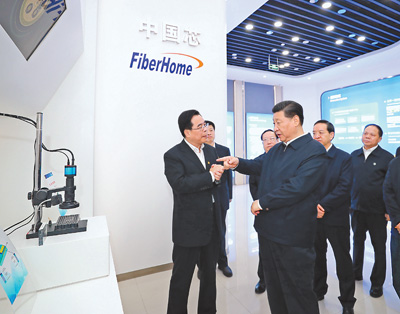 26日上午,习近平先后来到位于东湖高新区的烽火科技集团和武汉新芯集成电路制造有限公司,考察企业创新发展情况。东湖高新区是首批国家级高新区,2016年获批中国(湖北)自由贸易试验区武汉片区。这里是全球最大的光通信研发生产基地,被誉为“中国光谷”。在烽火科技集团,习近平听取武汉市新旧动能转换发展情况汇报,察看企业自主创新成果展示,了解企业优化调整产业结构和加强党建工作等情况。展厅里陈列着烽火科技集团以及长飞光纤光缆股份有限公司研制的芯片、光纤等高科技产品。习近平一边察看实物一边了解产品用途、性能、国产化率、在国际同行业中的地位等情况。听到介绍烽火科技在“超大容量、超长距离、超高速率”光通信领域的研发和生产处于世界领先地位,一根光纤上可实现67.5亿对人同时通话,总书记点头表示赞许。他语重心长对企业负责人说,新发展理念,创新是第一位的。我国已经成为世界第二大经济体,过去那种主要依靠资源要素投入推动经济增长的方式行不通了,必须依靠创新。具有自主知识产权的核心技术,是企业的“命门”所在。企业必须在核心技术上不断实现突破,掌握更多具有自主知识产权的关键技术,掌控产业发展主导权。国家需要你们在这方面加快步伐。他要求企业加强党建工作,以党建引领促进企业创新发展。
