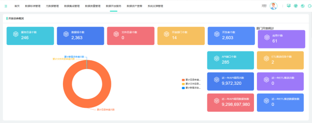 强化高质量数据共享。突出数据应用,提供高质量数据共享,提供数据服务目录246个、数据接口285个、累计提供数据量92亿余条。