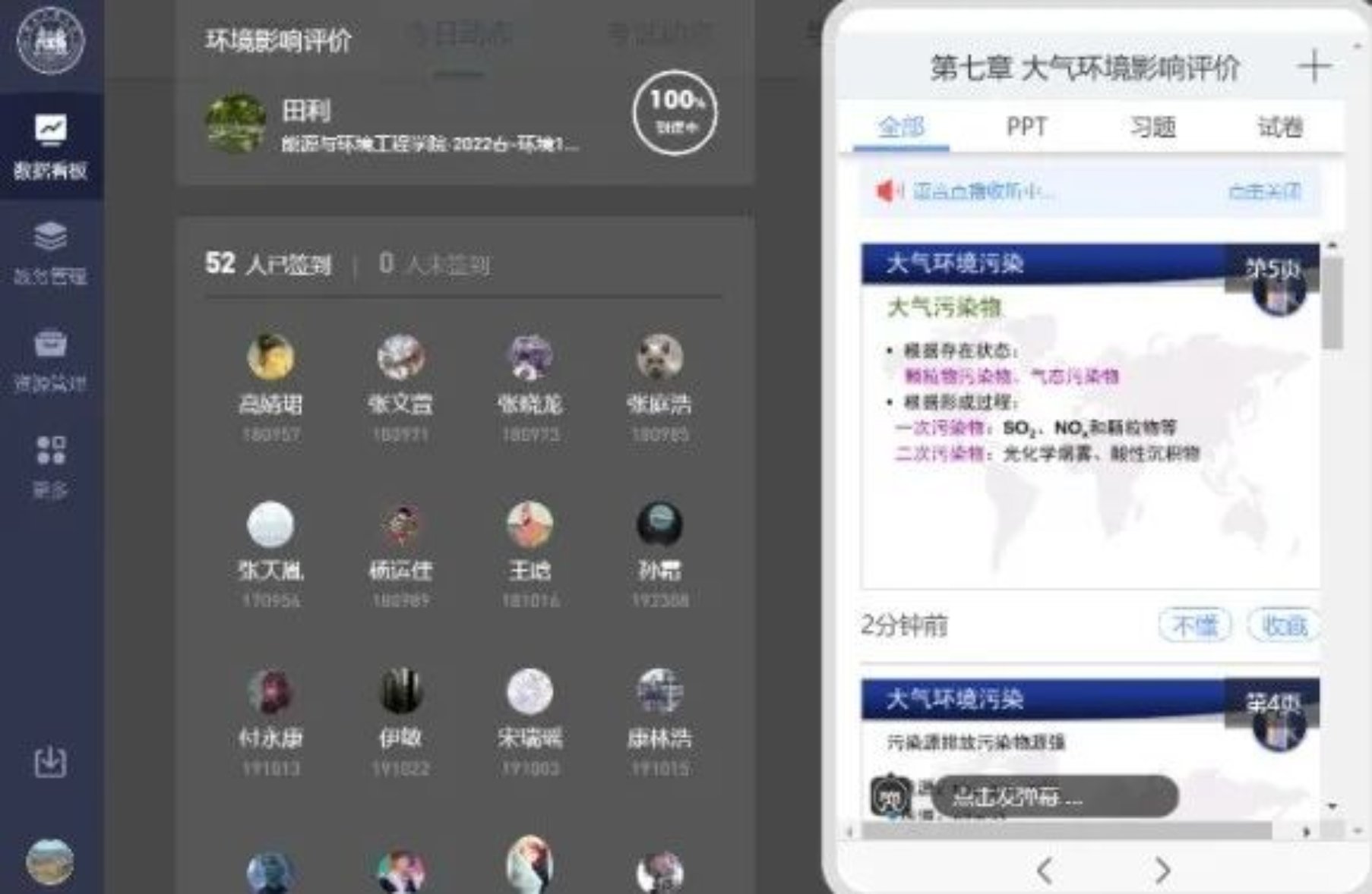 各位领导先后进入到《大学英语基础模块B》《工程电磁场》《环境影响评价》《思想道德与法治》《概率论与数理统计》等23个本科生课堂,《当代国外马克思主义前沿问题研究》《拓扑图论和纽结理论初步》《电子科学中的数值方法》等5个研究生课堂,了解到老师们课前准备充分,线上教学工具使用熟练,授课节奏和课堂掌控俱佳。有的在课件制作上下足功夫,教学内容丰富、图文并茂;有的充分利用新版雨课堂与腾讯会议对接优势,结合案例灵活切换两个平台,增强了学生的课堂沉浸感;有的通过在线互动,深入浅出的讲解重点和难点。期间各个课堂在线教学进程连贯,师生精神饱满,教学效果得到领导们的一致肯定。
