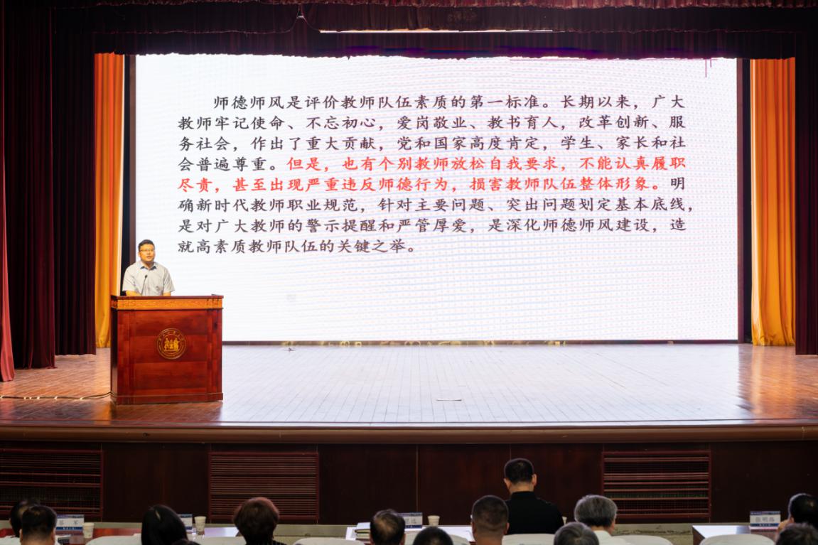 肖光文作题为“高标准高质量加强高校师德师风建设”的报告,强调高校要加强师德师风建设,铸造一支政治素质过硬、业务能力精湛、育人水平高超的高素质导师队伍。