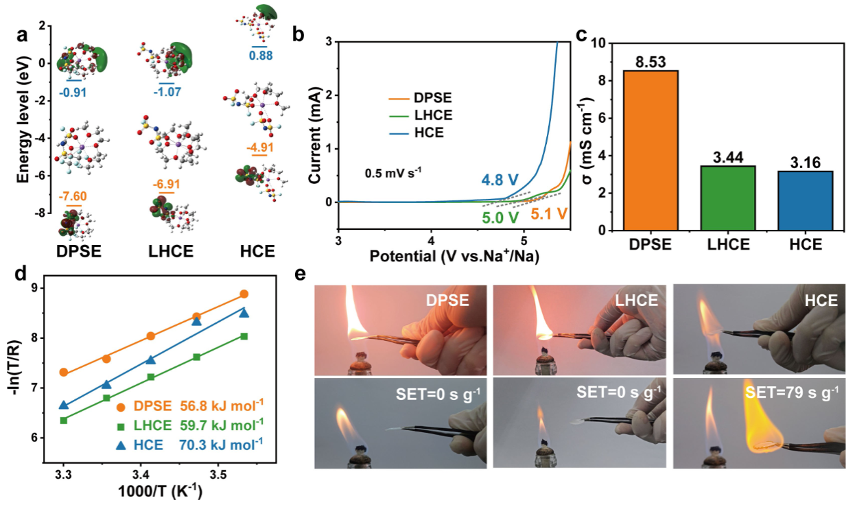 针对醚类电解液电化学稳定性差以及电极/电解液界面处存在不可控的枝晶生长等问题,应用弱配位稀释剂六氟异丙基甲醚(HFME)来调节Na+与二乙二醇二甲醚和阴离子的配位,形成稀释剂参与的溶剂化物。HFME的引入具有以下优势:(1)HFME中F取代基的吸电子效应会促使溶剂化结构的最高占据分子轨道能级降低,从而提高电解液的氧化稳定性;(2)溶剂化的HFME会加速阴离子和稀释剂的分解,有利于构建高质量的富含无机物的EEI,抑制界面副反应,促进Na的均匀沉积;(3)HFME的配位取代了部分溶剂分子,其弱配位作用有利于降低Na+的去溶剂化能,加快界面动力学过程;(4)HFME具有不可燃性,可以提升电池安全性。所组装的Na||Na对称电池在0.5 mA cm-2电流密度下可稳定循环超过1800 h。所组装的Na||P’2-Na0.67MnO2电池在400 mA g-1电流密度下循环350周后容量保持率为87.3%,平均库伦效率为99.7%。该工作提出了一种弱配位稀释剂策略,为新型局部高浓度电解液的构建和发展提供了新思路。(Angewandte Chemie International Edition, 2024, 63, e202400406)。